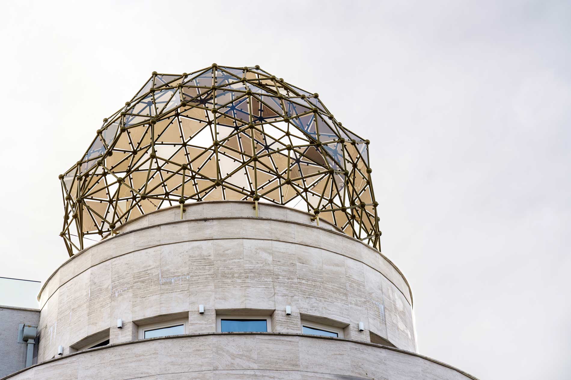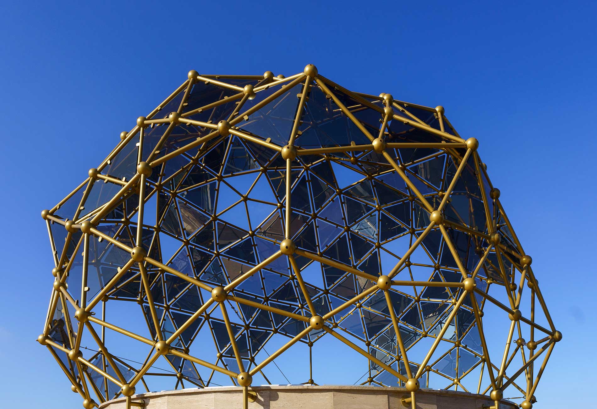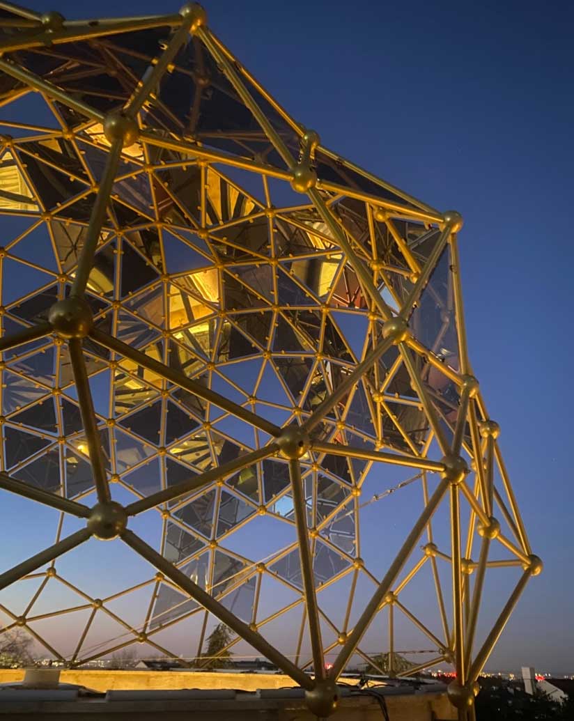 Rising approximately five meters high and spanning about eight meters in diameter at its widest point, the dome is constructed from aluminum coated in an elegant old gold finish. It comprises roughly 180 spheres, each 15 centimeters in diameter, serving as connecting nodes. These are linked by over 450 rods, each about a meter long, forming dominant pentagonal and hexagonal shapes as primary structural elements, complemented by triangular sections as secondary components. Every element is custom-made and varies in size.